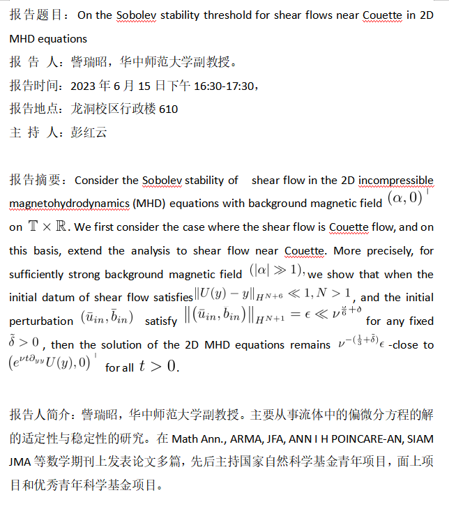 数苑讲坛2023(四十):On the Sobolev stability threshold for shear flows near Couette in 2D MHD equations