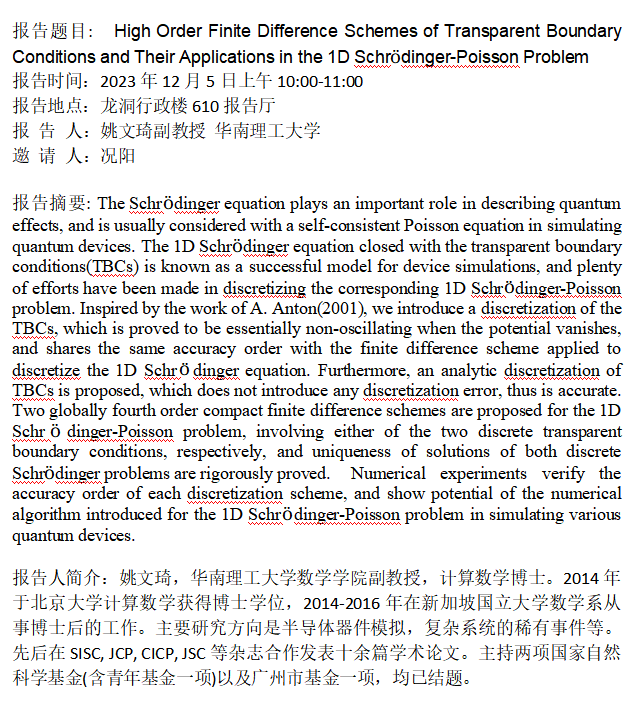 数苑讲坛2023(七十一): High Order Finite Difference Schemes of Transparent Boundary Conditions and Their Applications in the 1D Schrdinger-Poisson Problem