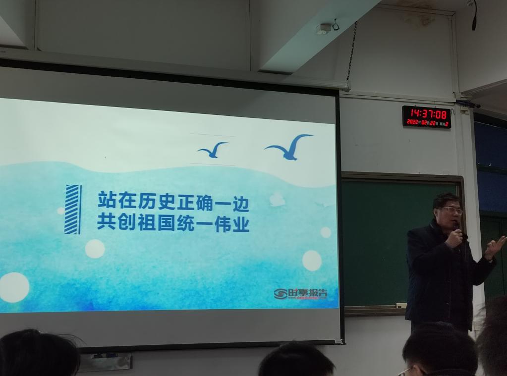 王振友院长则以《站在历史正确一边,共创祖国统一伟业》为题,从认清历史发展大势、认清“台独”的本质和危害、认清外部势力干涉图谋和认清广阔机遇和前景四方面阐述了新时代党对台工作的基本方针,勉励广大青年要志存高远、练就过硬本领,切实增强责任感、使命感,在以习近平同志为核心的党中央坚强领导下,助力国家的经济社会发展,坚定推动两岸关系和平发展、推进祖国和平统一进程。同时他也指出,以史为鉴、开创未来,号召同学们担负起强国有我统一有我的责任担当,共同创造祖国完全统一、民族伟大复兴的光荣伟业。
