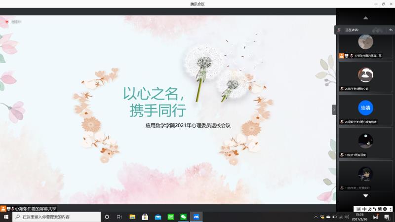 为及时关注学生返校后的心理状态,充分发挥心理委员在我院学生心理健康工作中的重要作用,我院“心苑”心理协会于2月26日下午以腾讯会议的形式召开了“以心之名,携手同行”心理委员返校工作会议。学院心理健康教育指导老师乔杉老师、心协成员以及全体心理委员参加了本次大会。