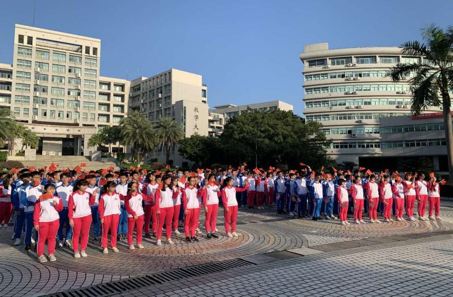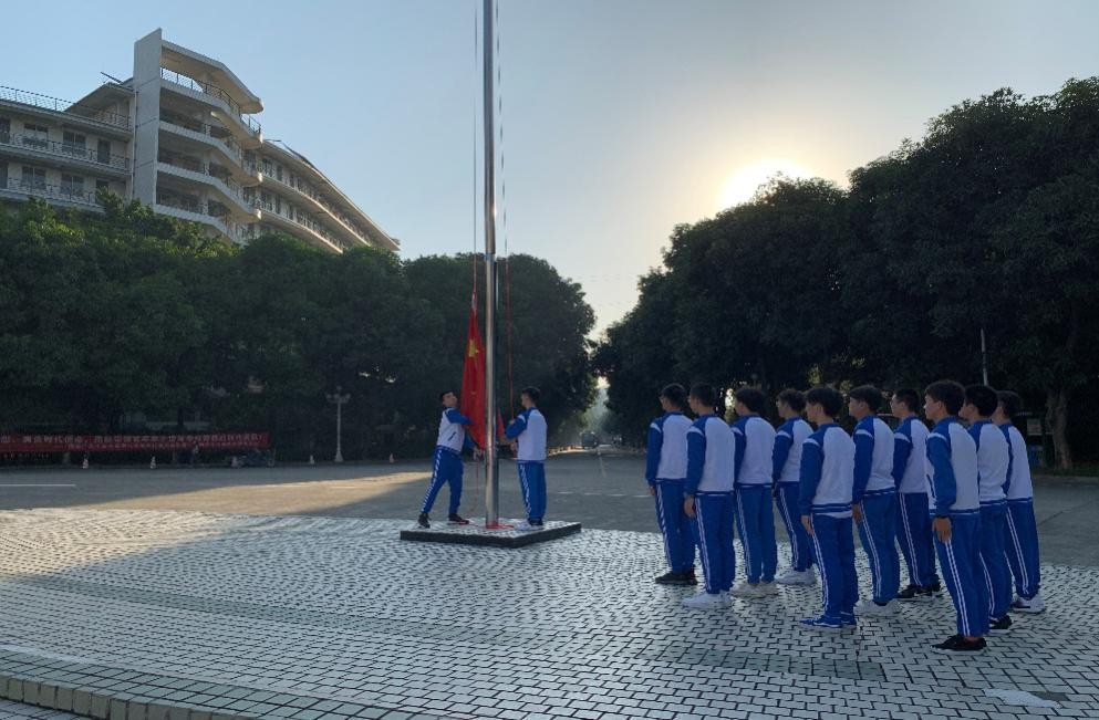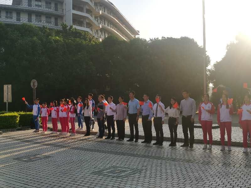 迎着朝阳,国旗护卫队成员护送着国旗,昂首挺胸,迈着铿锵有力的步伐走向升旗台。伴随着雄壮的《义勇军进行曲》,鲜艳的五星红旗冉冉升起,在场300多名师生肃然起敬,自豪地唱响国歌。