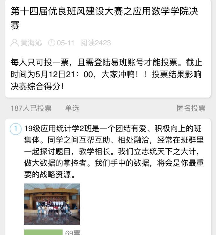 为在2019级营造良好的学风班风,创建优良班级,我院于5月6日启动班风建设大赛初赛和线上投票,我院2019级数学类6个班级、应统类2个班级参与了本次活动,并于5月13日晚上通过腾讯会议顺利举办了2019级班风建设大赛决赛。辅导员乔杉等老师担任院级总决赛的评委。