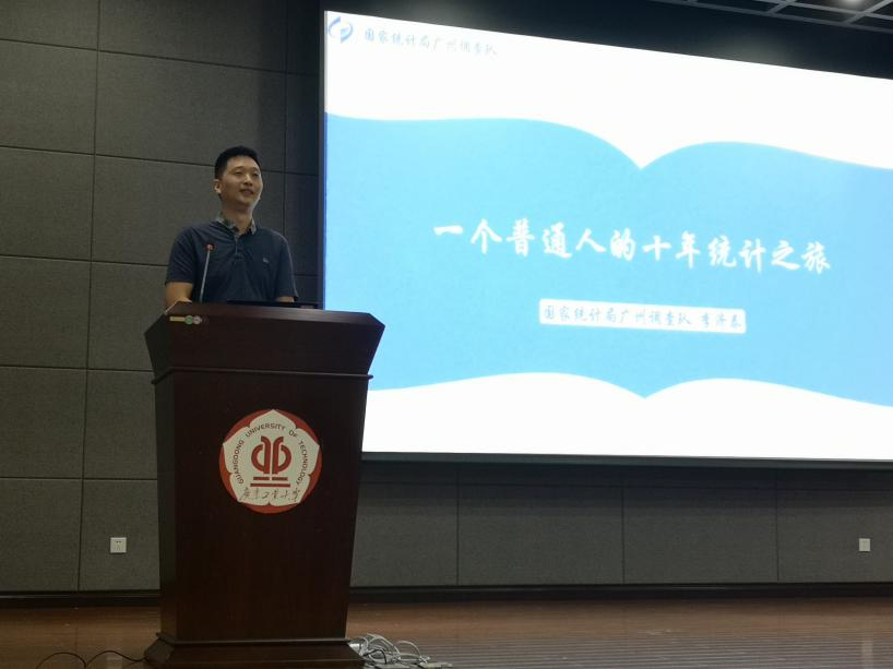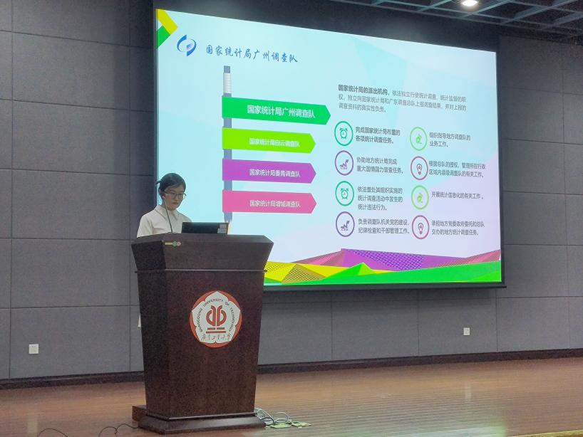 在教育宣讲环节,国家统计局广州调查队人事教育处处长曾莉围绕国家统计局广州调查队的基本情况、国家统计工作的发展历程以及单位报考等方面进行介绍。国家统计局广州调查队执法监督处(纪律检查室)副处长、机关纪委副书记梁宇作了题为《依法诚信统计,共同维护统计公信力》的主题宣讲,重点解读了《中华人民共和国统计法》《关于深化统计管理体制改革提高统计数据真实性的意见》和《关于更加有效发挥统计监督职能作用的意见》等法律法规、重要文件出台背景和主要内容。国家统计局广州调查队综合处副处长李济泰则以《一个普通人的十年统计之旅》为题,分享了他在统计岗位上的心路历程、收获及遇到的困难挑战,抒发其职业生涯当中体悟到荣誉感和使命感。这有利于拓宽同学们的专业认知,启迪新生同学树立底线思维并以认真负责态度投入大学的专业学习。