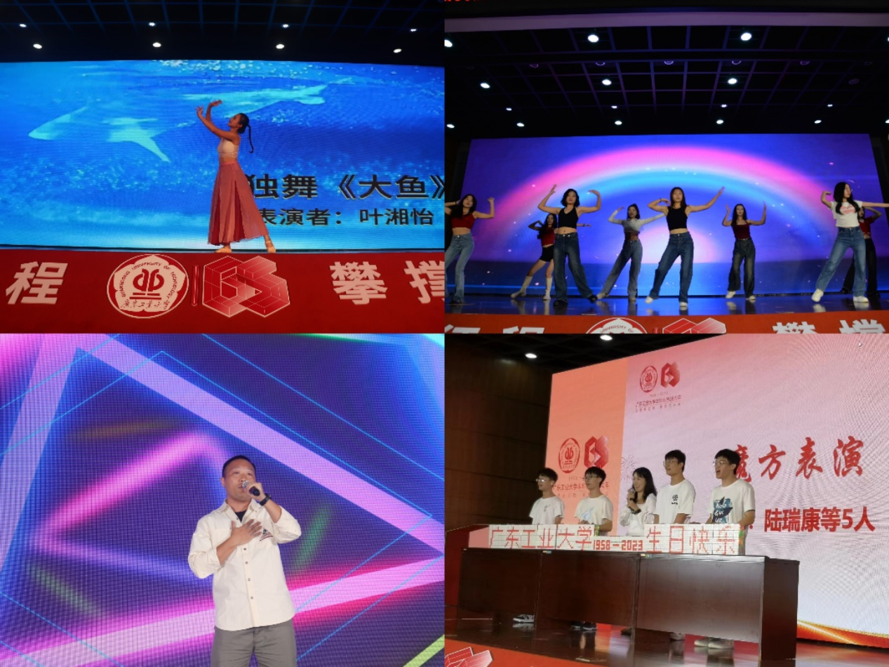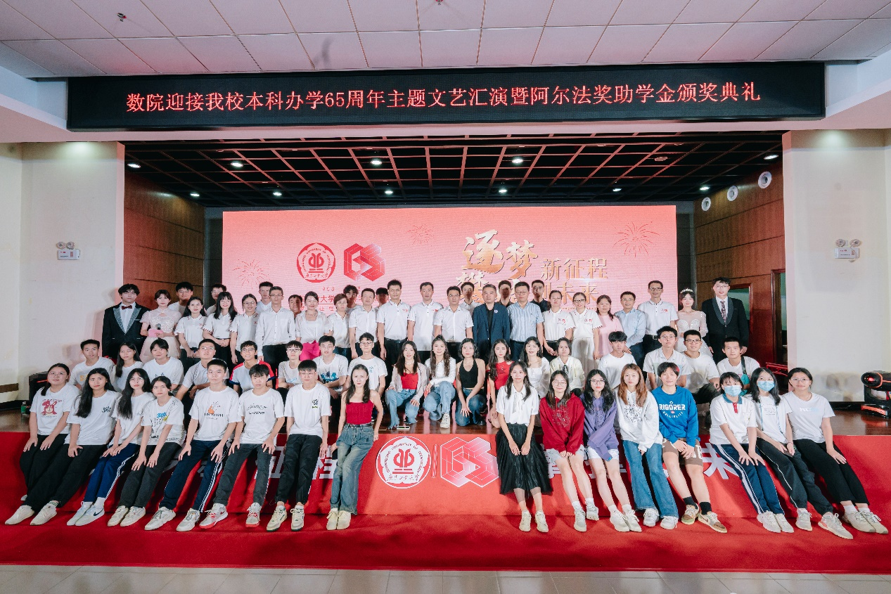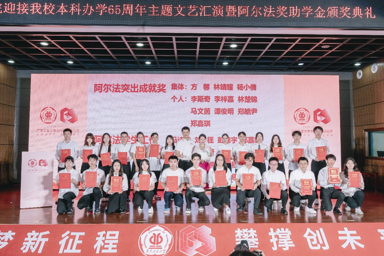 随后,学院在学术报告厅举办了“庆祝我校本科办学65周年主题文艺汇演暨阿尔法奖助学金颁奖典礼”。陈智奇院长介绍了学校的“1+2+3”攀撑计划以及学院当前的定位与规划,号召学院师生同心协力,勇毅前行,奋力开创学院高质量发展新局面。在主题文艺汇演环节,节目丰富多彩、精彩纷呈,既有曼妙的舞蹈表演《大鱼》、铿锵有力的《少年说》朗诵,充满青春律动的歌曲串烧,也有充满速度与激情的魔方表演,以及校友贺泓予献唱歌曲《倔强》等等,精彩的表演引得现场观众阵阵掌声,气氛热烈,充分彰显了我院师生和校友们的青春活力和昂扬斗志。在颁奖典礼环节中,学院领导和校友分会理事共同为获得“2023年阿尔法奖助学金”的55名同学进行表彰颁奖。获奖学生代表钟俊彬、冯颖茵表示将会牢记母校培养之恩和校友们的关心支持,积极回馈学院与社会,传承阿尔法奖助学金的助人育人精神,努力为社会作出应有的青春贡献。学院第二届校友理事会会长李桂先生作为校友代表发言,他以“感恩”二字展开,表示自己将会一如既往地支持母院人才培养工作,同时他也勉励同学们要以获奖学生为榜样,心怀感恩,认真学习知识和本领,带领更多的广工学子奋发向上,勇攀高峰。最后,全体师生和校友们共同合唱校歌《逐梦》,共同表达对母校本科办学65周年的深情祝福,将现场气氛推向最高潮。