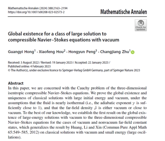 近期,我校吃瓜网每日大赛今日榜单彭红云副教授与华南理工大学朱长江教授、洪广益副教授和上海大学厚晓凤副教授在Navier-Stokes方程组经典解的整体适定性方面取得重要进展,证明了在绝热指数靠近1时,具有大初始能量的可压缩Navier-Stokes方程组经典解是整体存在的,并且允许无穷远处包含真空。相关研究成果以“Global existence for a class of large solution to compressible Navier–Stokes equations with vacuum” 为题,发表在国际著名期刊 Mathematische Annalen上 (署名按照作者姓氏字母顺序排列),论文链接:https://link.springer.com/article/10.1007/s00208-023-02573-2。