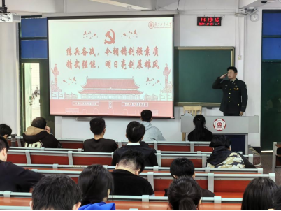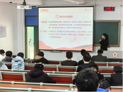 随后,林莉子老师进行征兵宣讲动员。林老师结合征兵入伍的相关政策及身边参军入伍同学的优秀事例,从征兵入伍的基本条件、入伍流程及优待政策等方面进行详细解读,并鼓励同学们携笔从戎,参军报国。大会也邀请管理学院退役大学生张安驰同学现场分享个人的军旅故事。他通过分享自己在部队的亲身经历及个人的收获成长,鼓励同学们积极投身国防事业,为国家安全贡献青春力量。