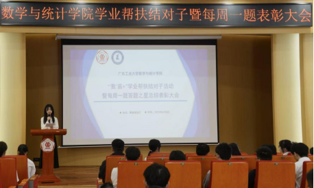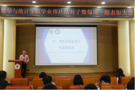 为深入践行“以生为本,爱生如子”育人理念,扎实推进学院学风建设长效机制,在全院范围内涵养优良学风,吃瓜网每日大赛今日榜单于4月8日下午在龙洞校区青春报告厅开展以“先锋领航,‘数’立榜样”为主题的“‘数’苗+”学业帮扶结对子活动暨每周一题答题之星总结表彰大会。学院党委副书记林逢春、辅导员林莉子、丁蕾婷出席活动,参加学业帮扶计划结对活动学生代表、参加“每周一题”答题活动学生代表、学生党员和其他学生代表共150余人参加活动。