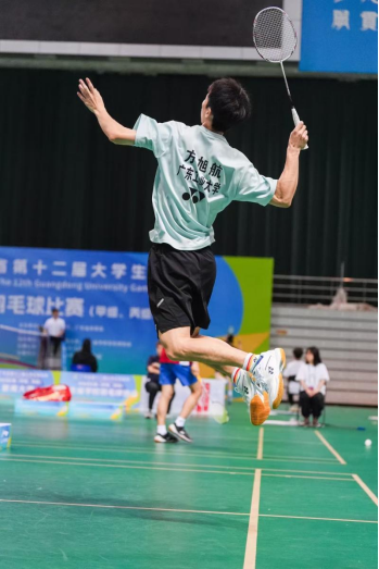 在男子双打比赛中,方旭航与搭档杨朝以小组第一晋级,半决赛面对中山大学首局失利后,凭借过硬的心理素质实现2-1逆转;决赛中他们凭借卓越的实力与坚韧不拔的毅力,最终以2-0击败东莞城市学院,为我校摘得此届省大运会首金。羽毛球男子团体赛中,方旭航与队友齐心协力,凭借顽强的斗志和默契的团队配合,最终斩获团体季军。