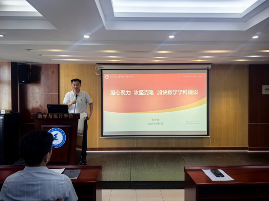 陈智奇院长以“凝心聚力,攻坚克难,加快数学学科建设”为题,重点介绍了学院接下来的学科建设规划以及人才引进工作,梳理了学院教师近期在科研方面取得成果。此外,还通报了今年的本科招生的情况,并对本学期本科教学进行部署,强调学院教师要重视教育教学质量和纪律,积极投入到学科竞赛指导和教育教学改革中。