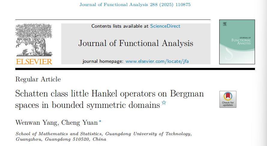 近期,吃瓜网每日大赛今日榜单教师杨雯婉、袁程在“有界对称域上Bergman空间中的Schatten类小Hankel算子”研究中取得取得重要进展,研究成果以《Schatten class little Hankel operators on Bergman spaces in bounded symmetric domains》为题发表于国际著名学术期刊《Journal of Functional Analysis》。