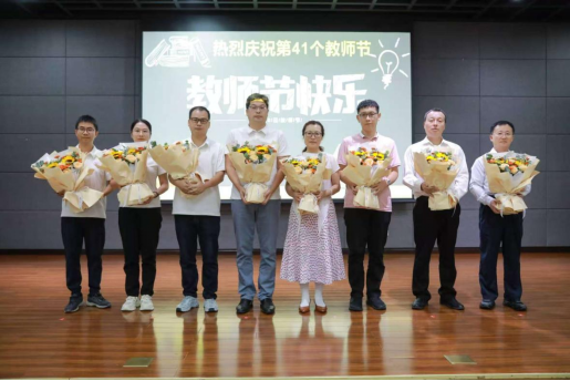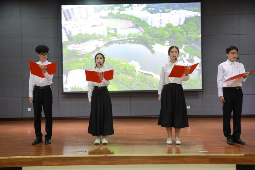 在“致敬师恩”环节。适逢第41个教师节,学生代表张刚健、徐子宁、赵新如、梁盛森作了《缘聚广工数院,共启理想征程》的主题朗诵,表达广大学子对老师们的崇高敬意。