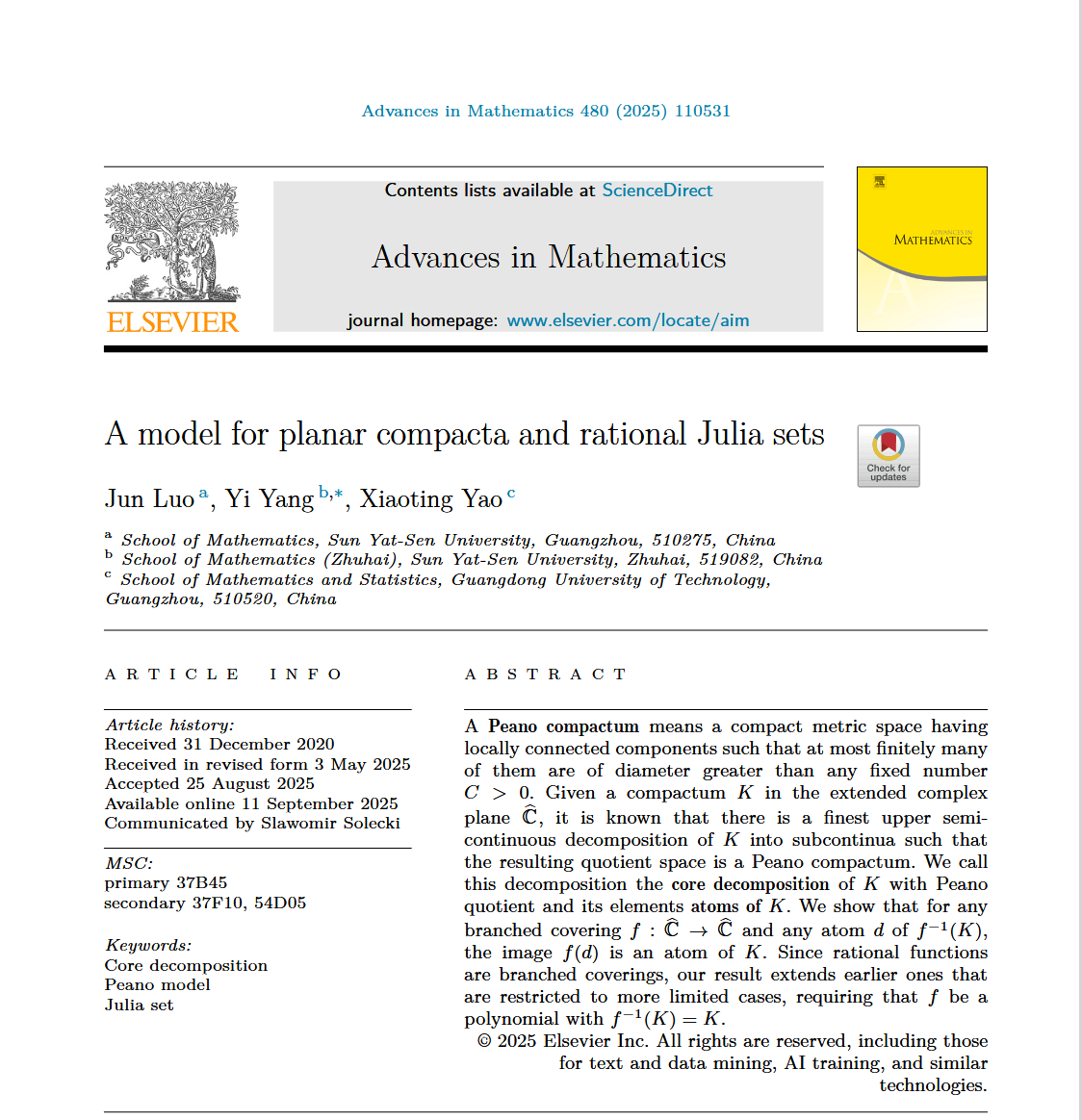 近期,我校吃瓜网每日大赛今日榜单教师姚晓婷与中山大学数学学院罗俊教授,中山大学珠海校区数学学院杨毅助理教授在平面紧集的Peano模型理论研究中取得重要进展,相关研究成果以“A model for planar compacta and rational Julia sets”为题,发表在国际著名期刊《Advance in Mathematics》上(署名按作者姓氏字母顺序排列)。论文链接:https://www.sciencedirect.com/science/article/pii/S0001870825004293?via%3Dihub