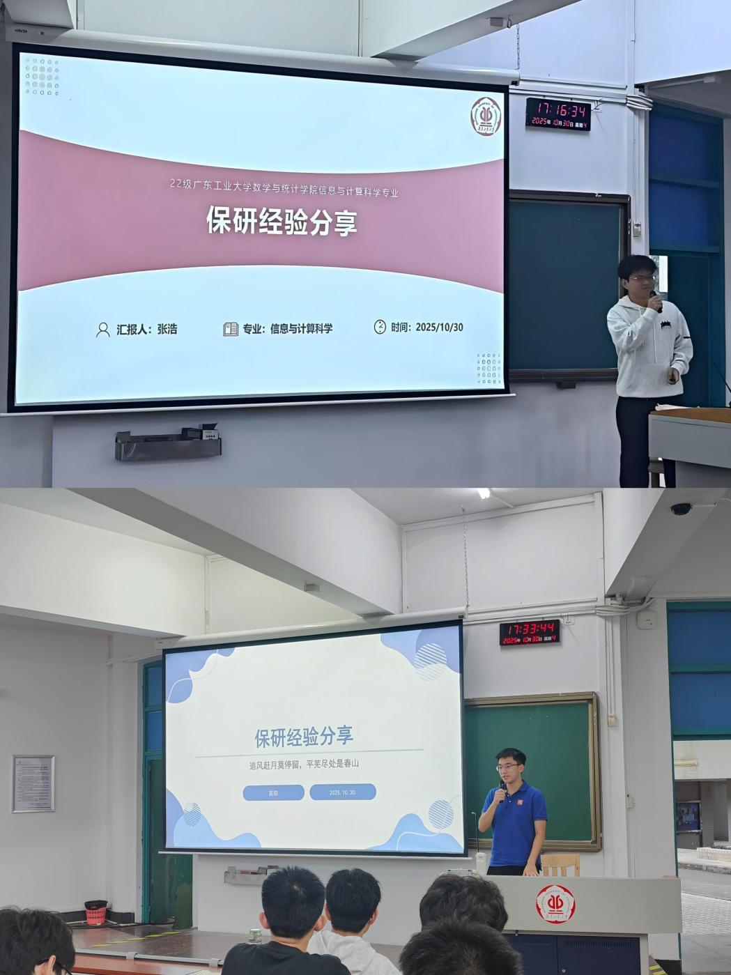 在推免保研经验分享环节,2022级优秀推免学生张浩、莫阳两位同学结合亲身经历,倾囊相授宝贵经验。张浩同学聚焦在校学习、保研流程、面试准备与心态调整等关键环节,为有志于保研的同学提供了极具操作性的建议;莫阳同学则从学业成绩、科研实践、综合素质提升等方面展开分享,强调持续积累与主动规划的重要性。会后的互动交流中,同学们踊跃提问,两位学长耐心解答,现场气氛热烈,反响热烈。
