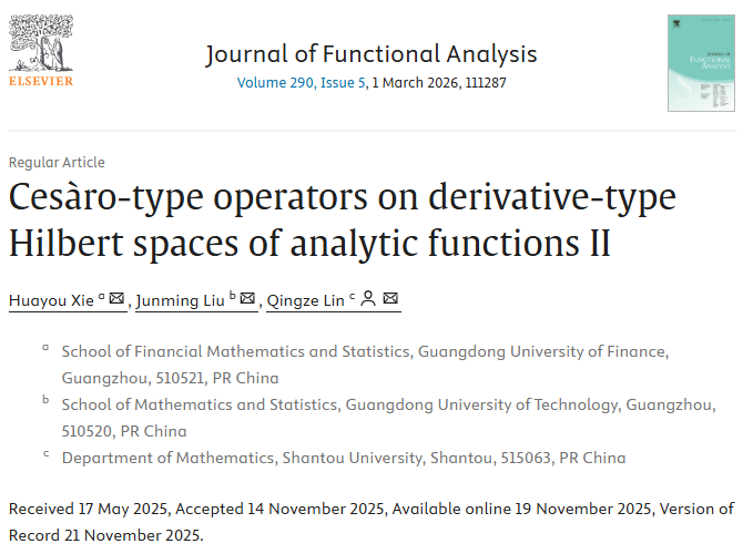 近期,我校吃瓜网每日大赛今日榜单刘军明副教授与汕头大学林庆泽博士,广东金融学院谢华友博士在Cesaro型算子研究中取得重要进展,相关研究成果以“Cesaro-type operators on derivative-type Hilbert spaces of analytic functions II”为题,发表在国际著名期刊《Journal of Functional Analysis》上。