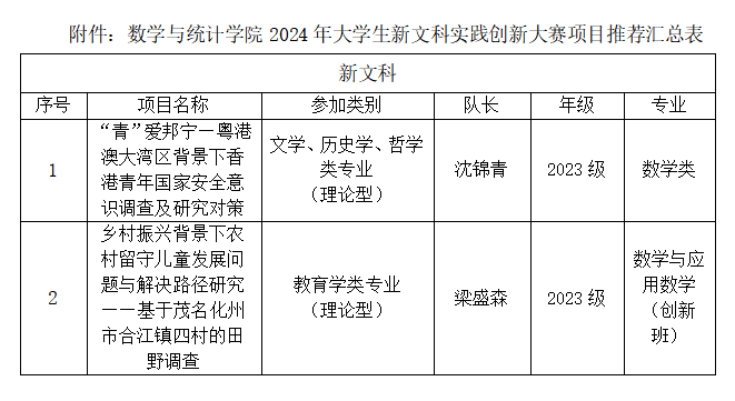 根据学校《关于组织参加2024年大学生新文科实践创新大赛的通知》要求,我院开展了2024年大学生新文科实践创新大赛项目评审推荐工作。经学生团队申报,专家评审后,拟推荐新文科创新项目2项,现对拟推荐项目予以公示。