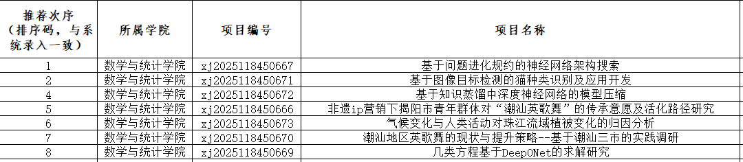 根据教务处《关于开展2025年大学生创新训练计划中期检查暨国家级、省级项目推荐工作的通知》的相关要求,现将学院审核通过中期检查的创新训练项目排序进行公示。